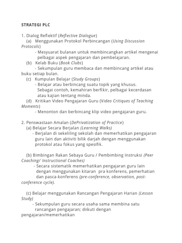 · (b) bimbingan rakan sebaya guru / pembimbing instruksi (peer · (c) belajar menggunakan rancangan . Ada 4 jenis aktiviti plc yang digalakkan.